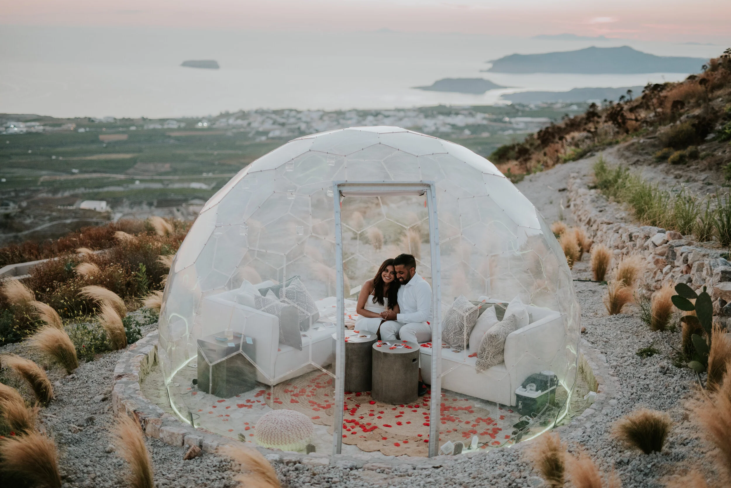 We are pleased to offer an experience like no other. In collaboration with Santorini Sky we decorated this beautiful Sky Dome which is perfectly located at the highest point on Santorini, 2,000 feet above sea level, with views to infinity.